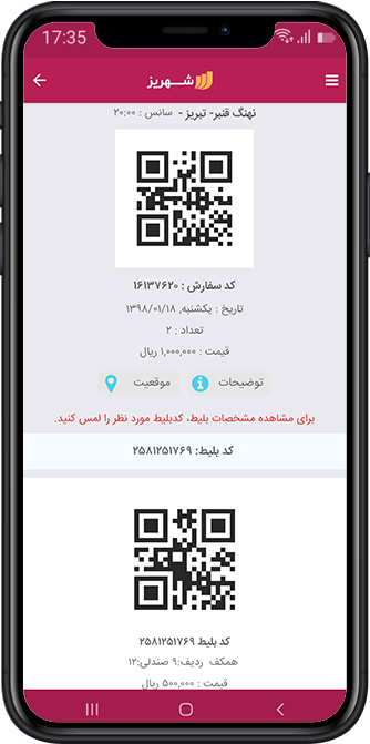 با شهریز میتونی صندلی دقیقت رو در برنامه های سالنی انتخاب کنی و جایگاه خودت رو روی بلیطت داشته باشی